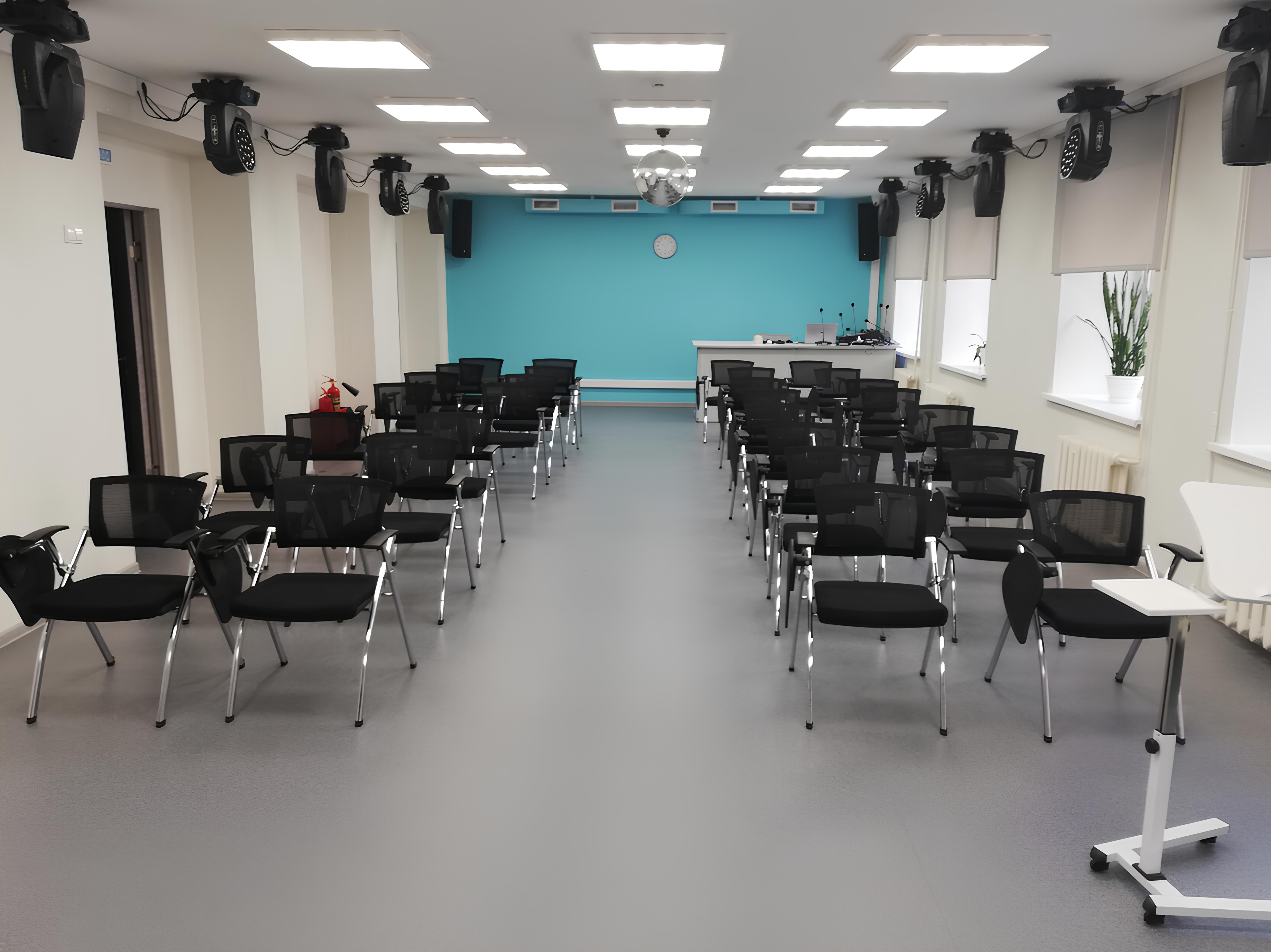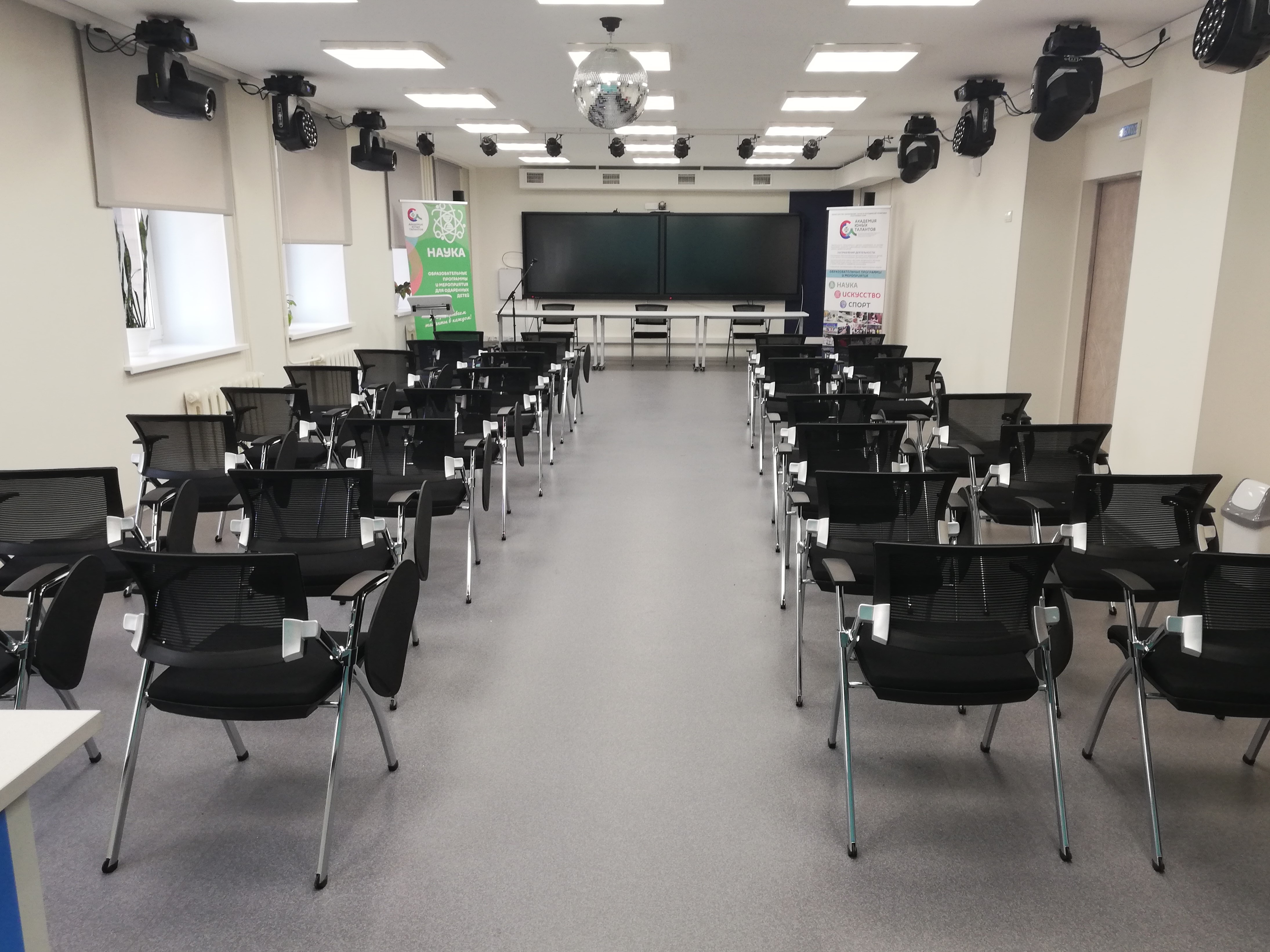 В зал подбирались складные стулья с пюпитром для расстановки в две колонны, а в зону президиума – переносная трибуна. Вокальная радиосистема с ручным микрофоном, комплект микрофонных стоек и головная радиосистема с поясным передатчиком обеспечат звуковое сопровождение во время лекций, презентаций, защиты проектов и других выступлений.