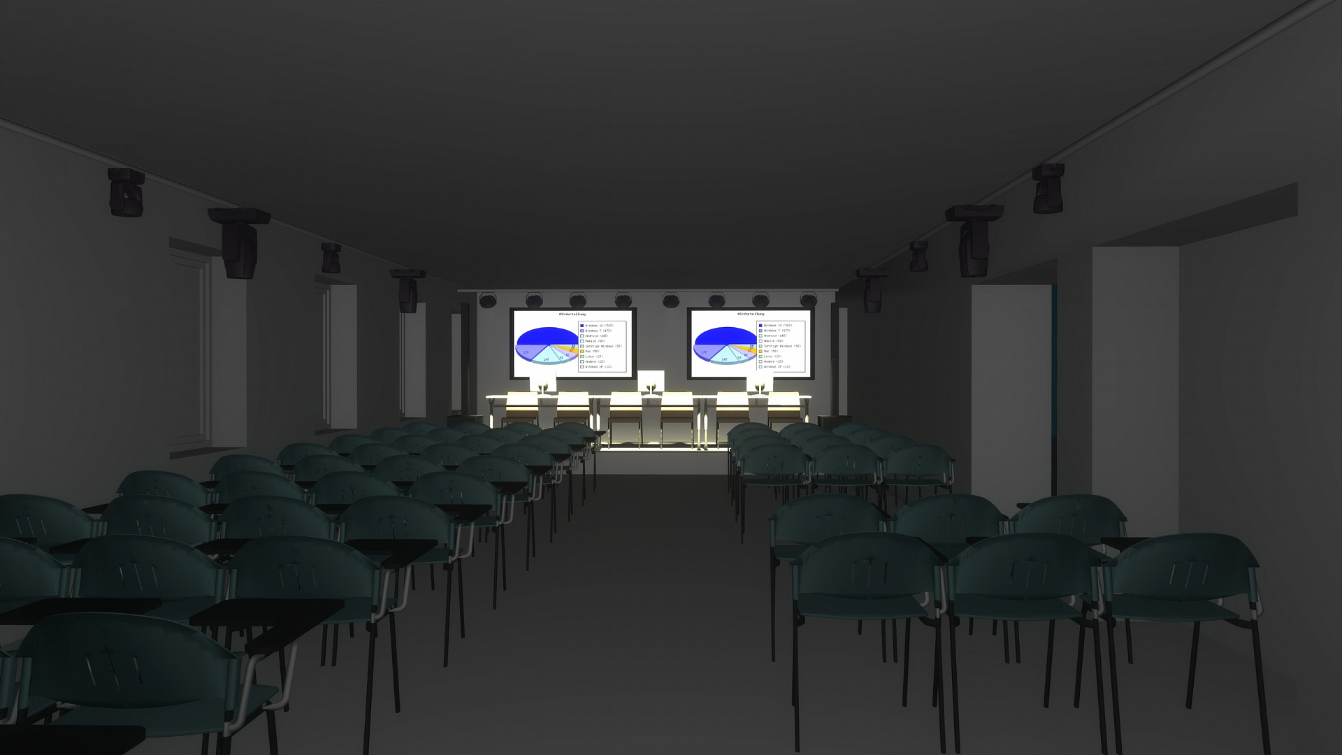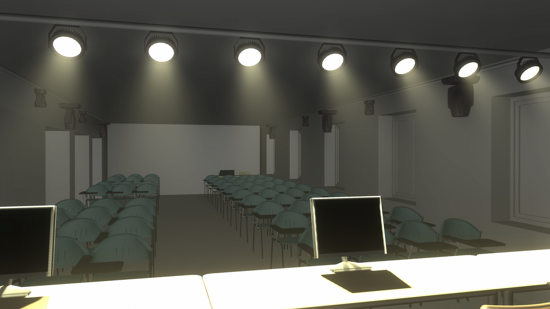 Лекторий в Академии используется и как небольшой актовый зал для проведения дискотек. Особое внимание здесь уделялось организации освещения. В зоне президиума были размещены восемь светодиодных прожекторов типа PAR, обеспечивающих равномерное освещение сцены и возможность подсветки отдельных объектов. В рамках светового оформления реализованы эффекты изменения цвета и их смешения, а также стробоскопические эффекты для создания вспышек различной интенсивности и повторяемости.