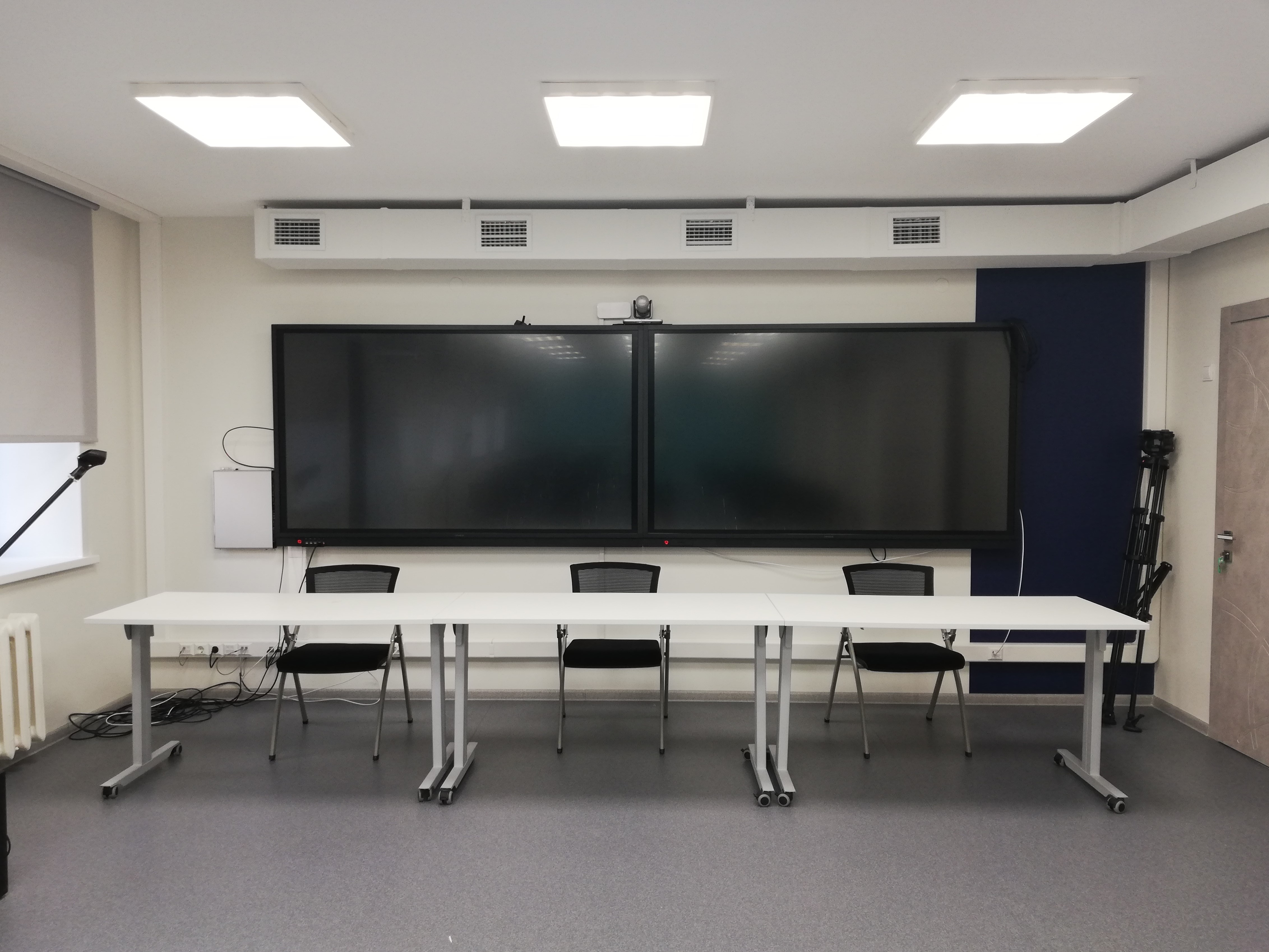 Система видеоконференций Polycom поддерживает одновременное подключение двух мониторов: один для отображения участников встречи, другой – для демонстрации контента, а также подключение нескольких камер для съемки с разных ракурсов. Для этого в аудиторию дополнительно подобраны две 86-дюймовые интерактивные панели с OPS-компьютером, цифровая 4K-камера со штативом, карта видеозахвата для записи трансляций с камер и видеомикшер, позволяющий одновременно выводить на дисплеи изображения спикеров и демонстрируемую презентацию. Системой также предусмотрена возможность организации многоточечных конференций: до 8 участников при SD-разрешении и до 4 – при HD.