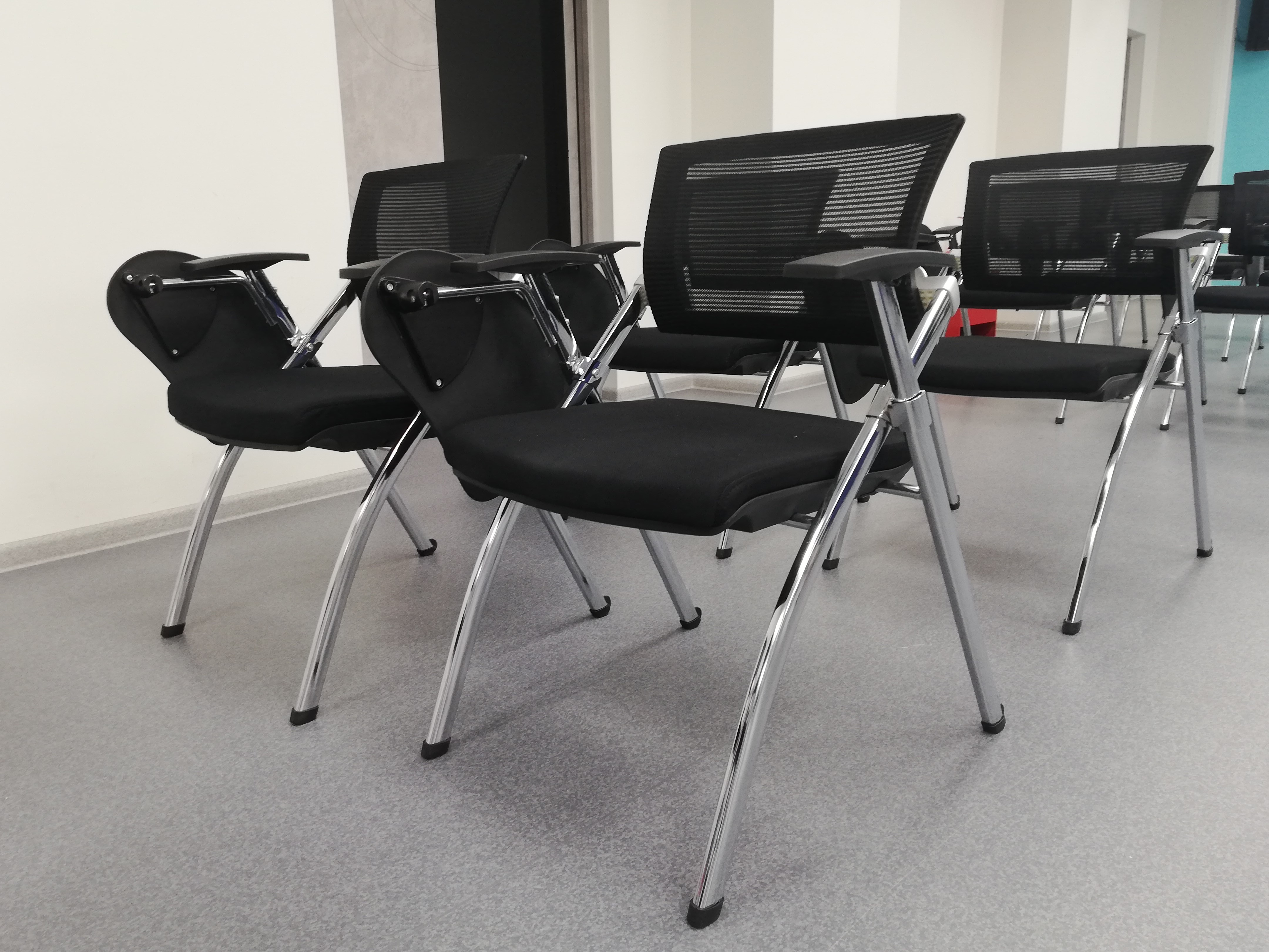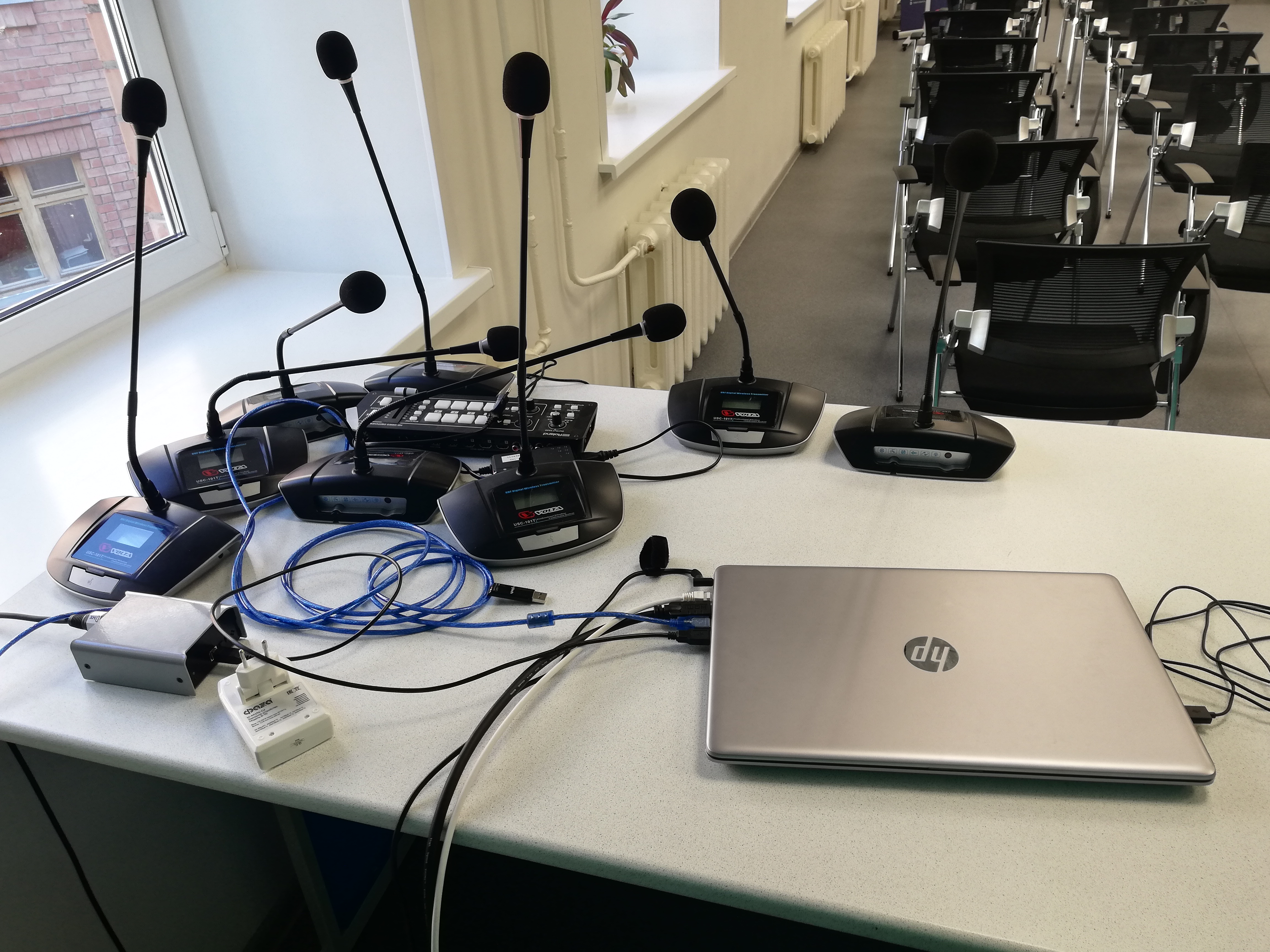 Беспроводная дискуссионная система с восемью настольными микрофонами послужит для эффективного проведения обсуждений и позволит каждому участнику быть услышанным. Для зоны президиума закуплены складные конференц-столы и складные стулья. Столешницы столов откидываются под углом 90°, что обеспечивает удобство их компактного хранения в подсобном помещении.