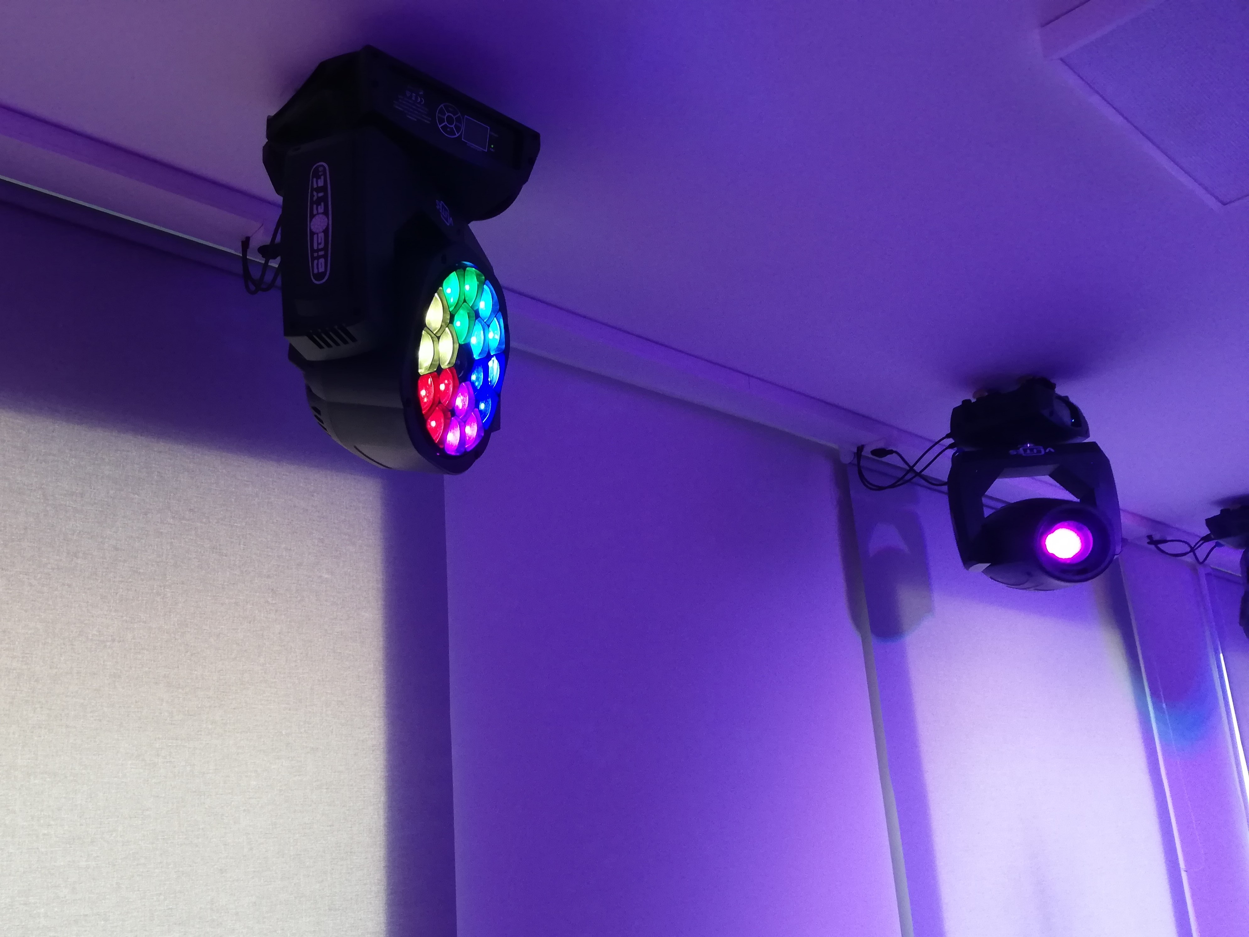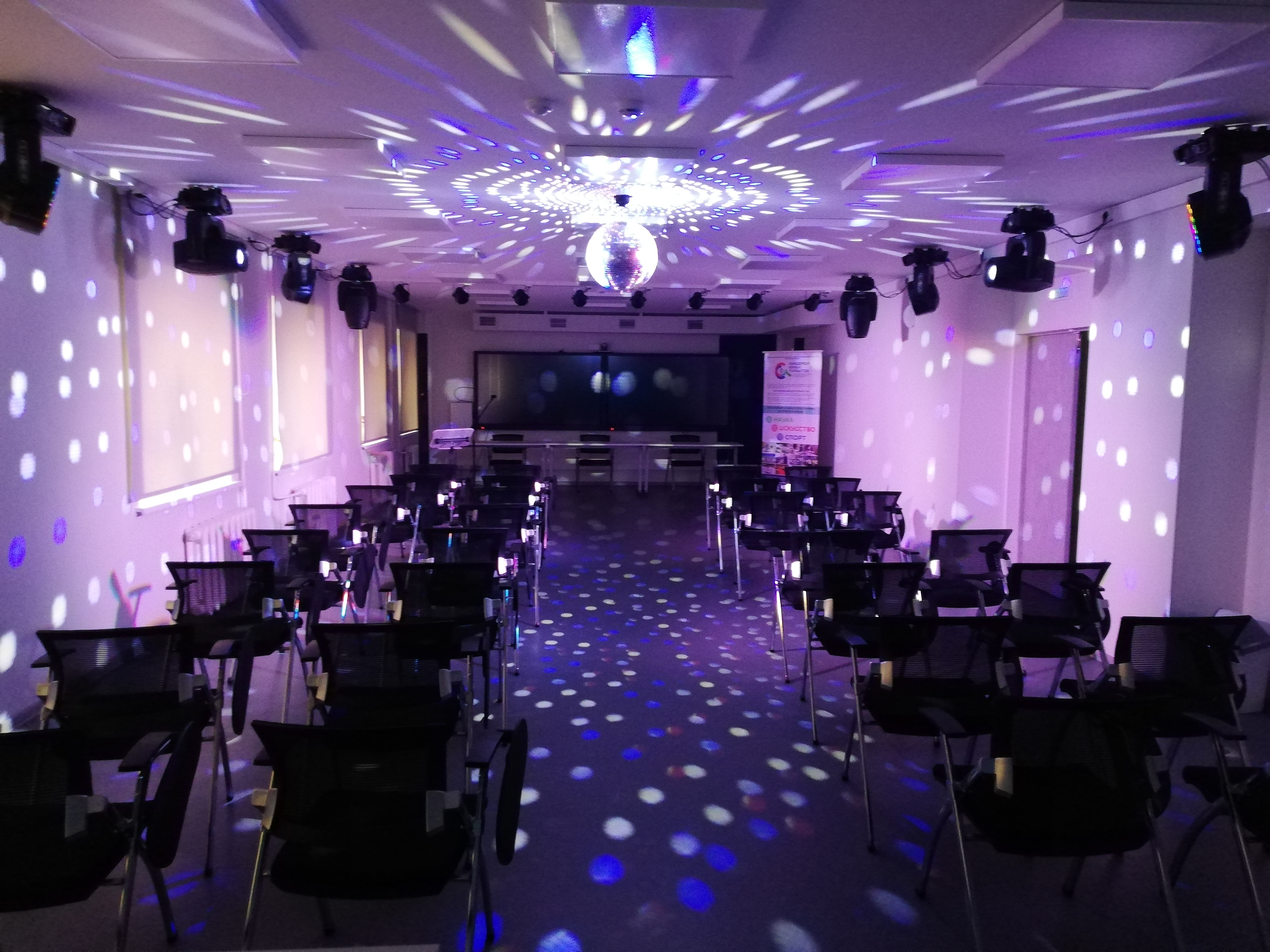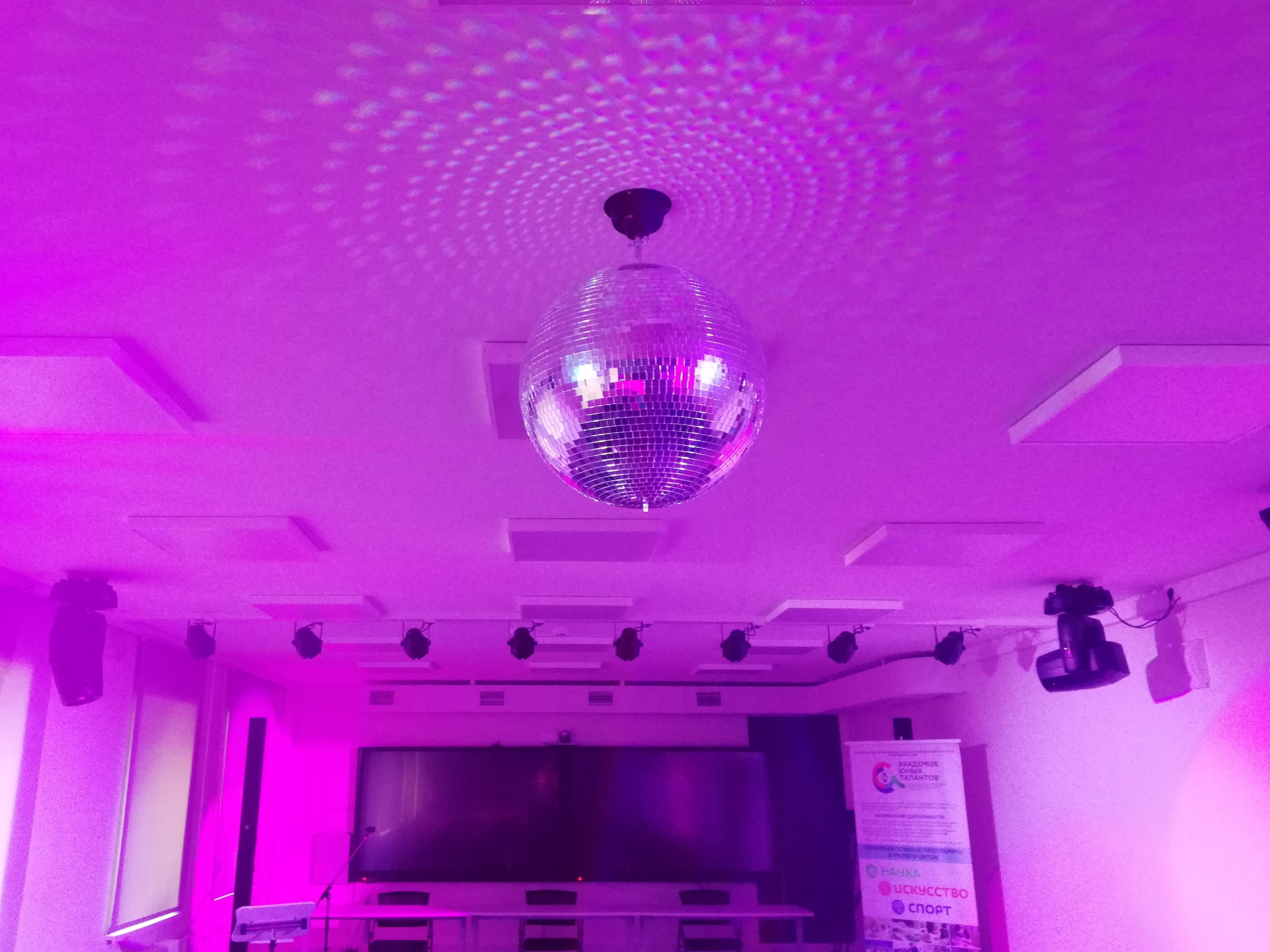 Вдоль зала установлены вращающиеся прожекторы двух типов: WASH BEAM B-EYE и SPOТ. Поворотная голова WASH BEAM B-EYE («пчелиный глаз») оснащена специальной формой линз и механизмом, который позволяет разбивать основной луч на 19 отдельных лучей разного цвета (RGBW) и вращать их в хаотичном порядке, создавая более 4 млрд оттенков. Прожекторы типа SPOТ с направленным лучом дополняют световую инсталляцию. Свое место в центре зала занял зеркальный шар. Дополнительно приобретен генератор тумана с нагревательным элементом.