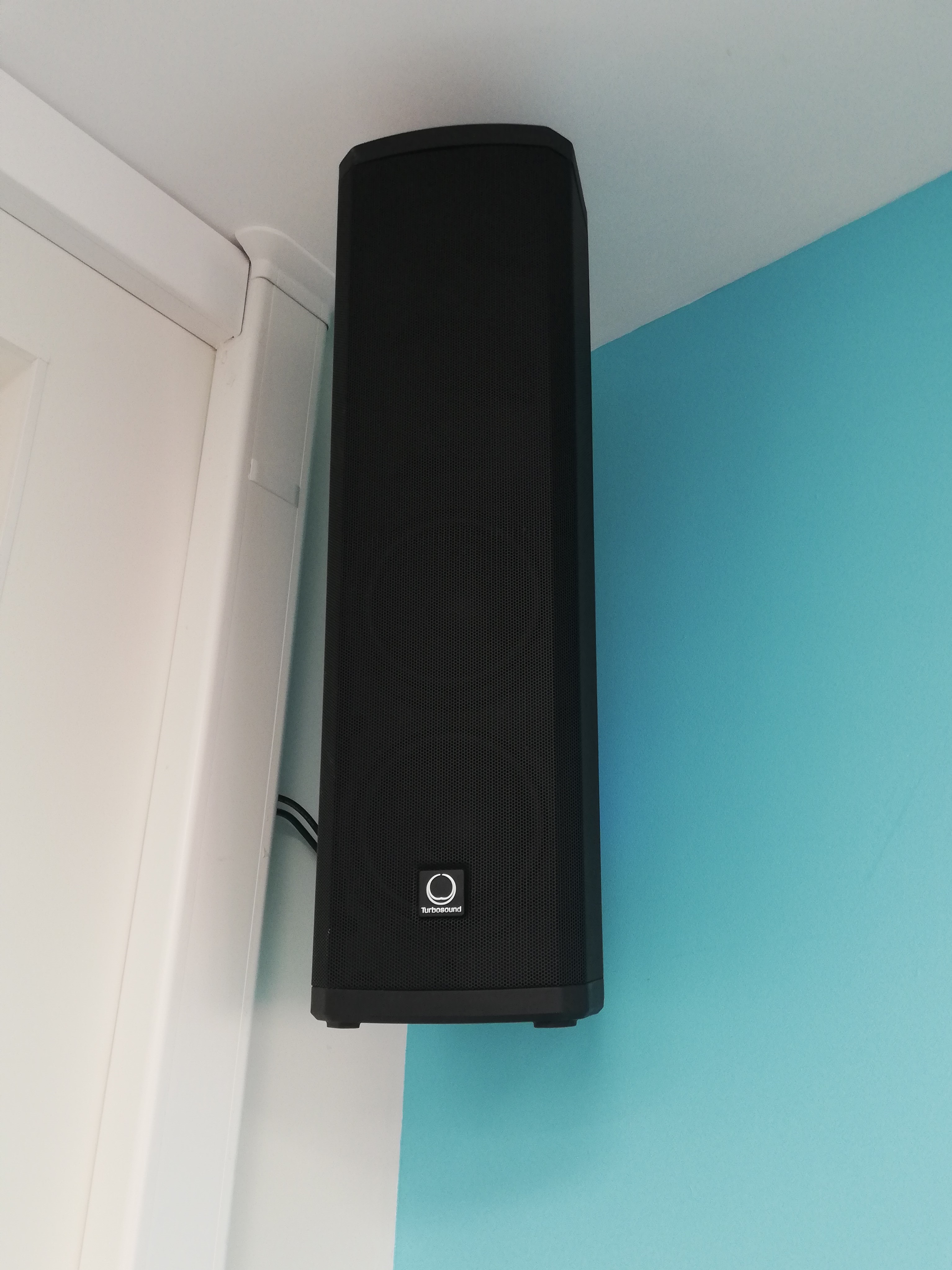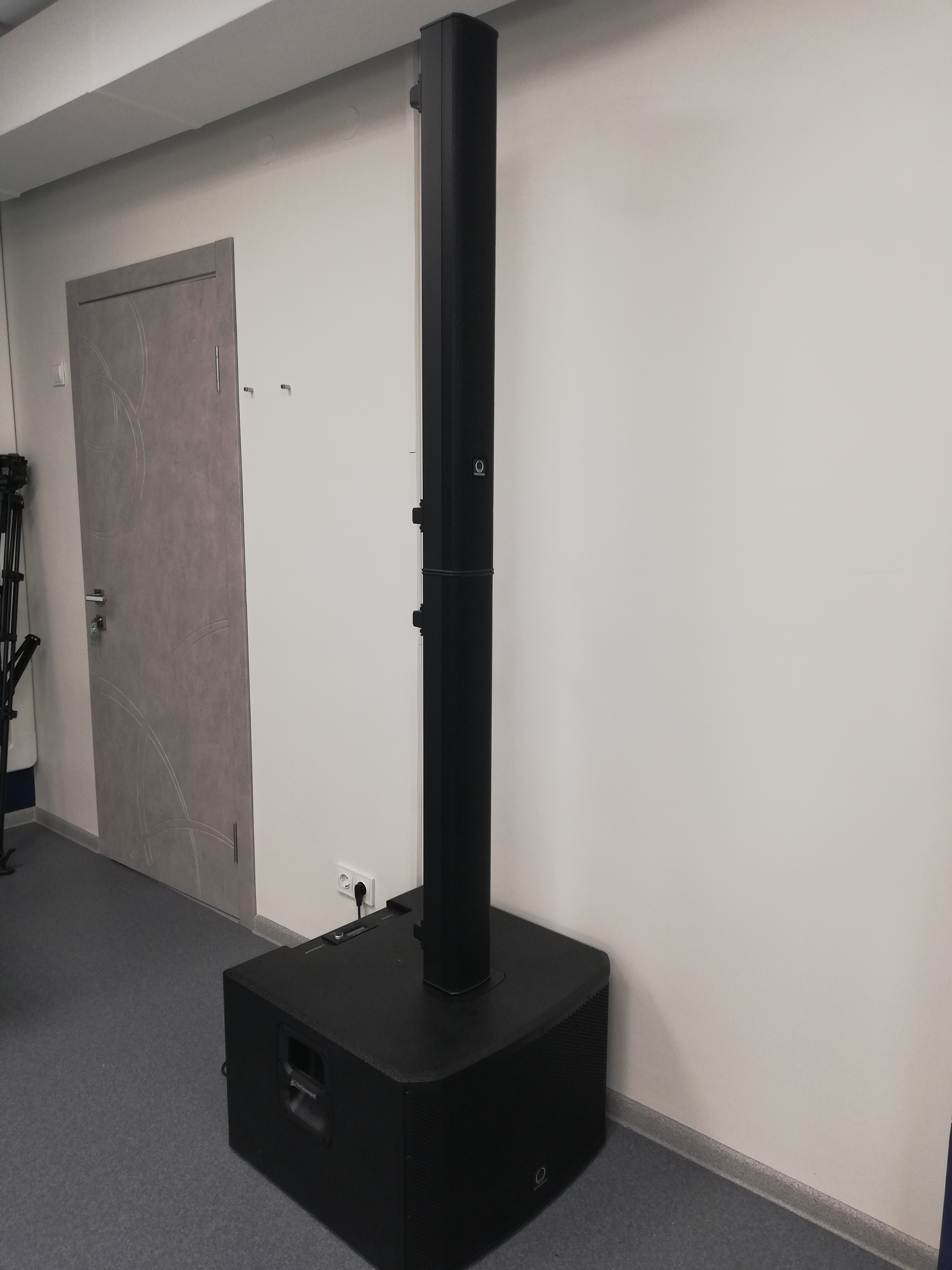 Рядом со сценой появились две модульные колонны Turbosound iP3000. Эти акустические системы предназначены для озвучивания небольших залов во время музыкальных мероприятий. Конструкция Turbosound iP3000 включает активный сабвуфер (усилитель мощности) и акустическую колонну-сателлит. Процессор Klark-Teknik гарантирует ровное звучание во всем диапазоне частот и позволяет качественно воспроизводить разнообразный музыкальный материал. На противоположной от сцены стене зала установлены две компактные аудиоколонны этой же серии.