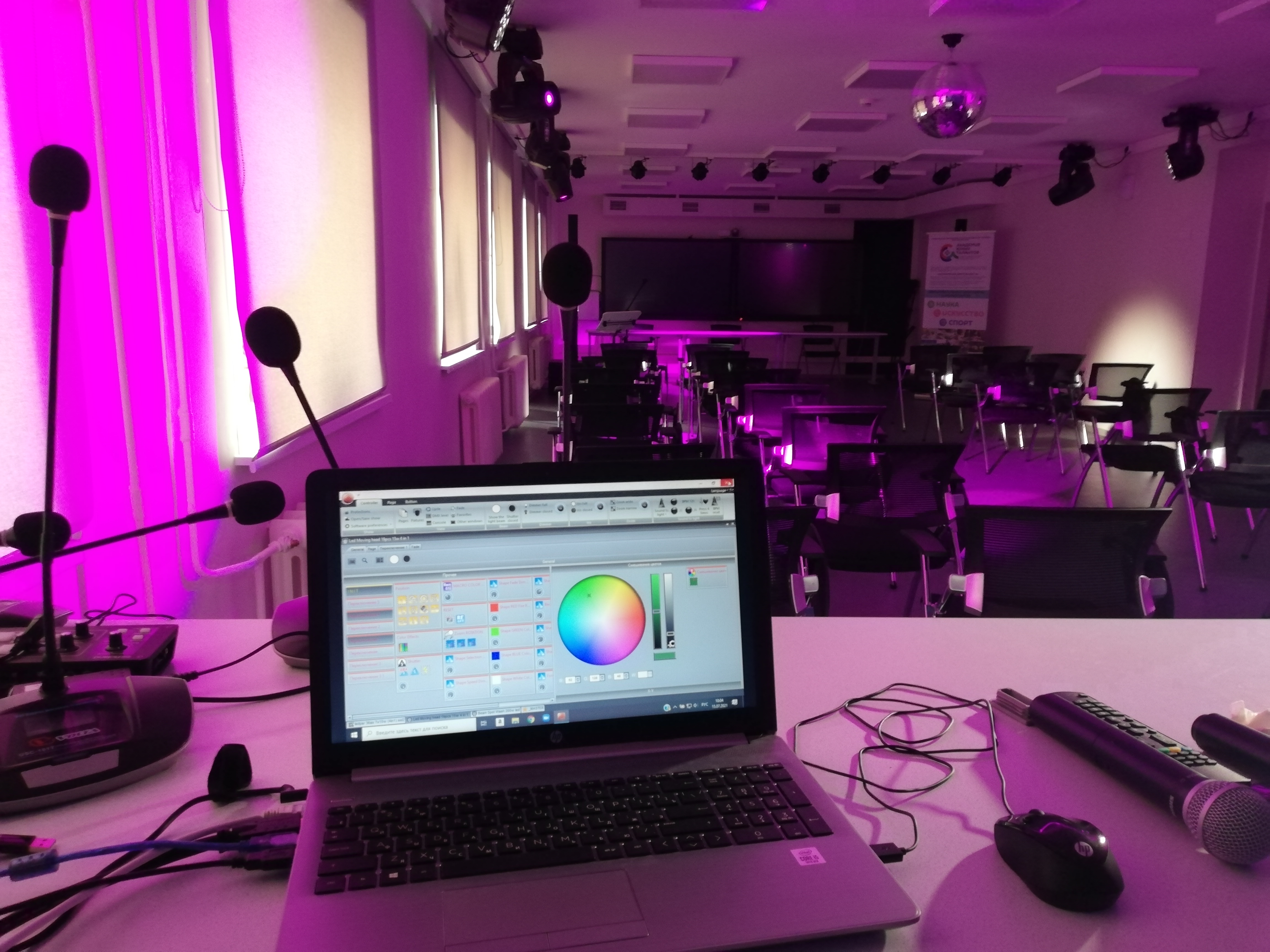 Управление световым, звуковым и видеооборудованием осуществляется с рабочего места оператора, оснащенного ноутбуком, DMX-пультом и видеомикшером. DMX-контроллер используется для управления световым оборудованием: позволяет регулировать параметры освещения, создавать разнообразные спецэффекты и сложные осветительные сценарии. Световые программы настраиваются на ноутбуке с помощью специализированного программного обеспечения и затем передаются в DMX-контроллер.