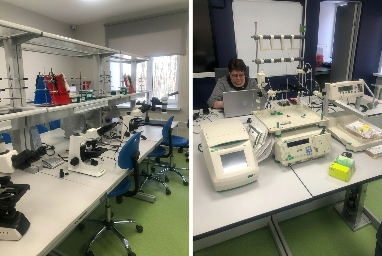 - Для углубленного изучения биологии — ПЦР-боксы для работы с ДНК, аналитические весы, жидкостный хроматограф.